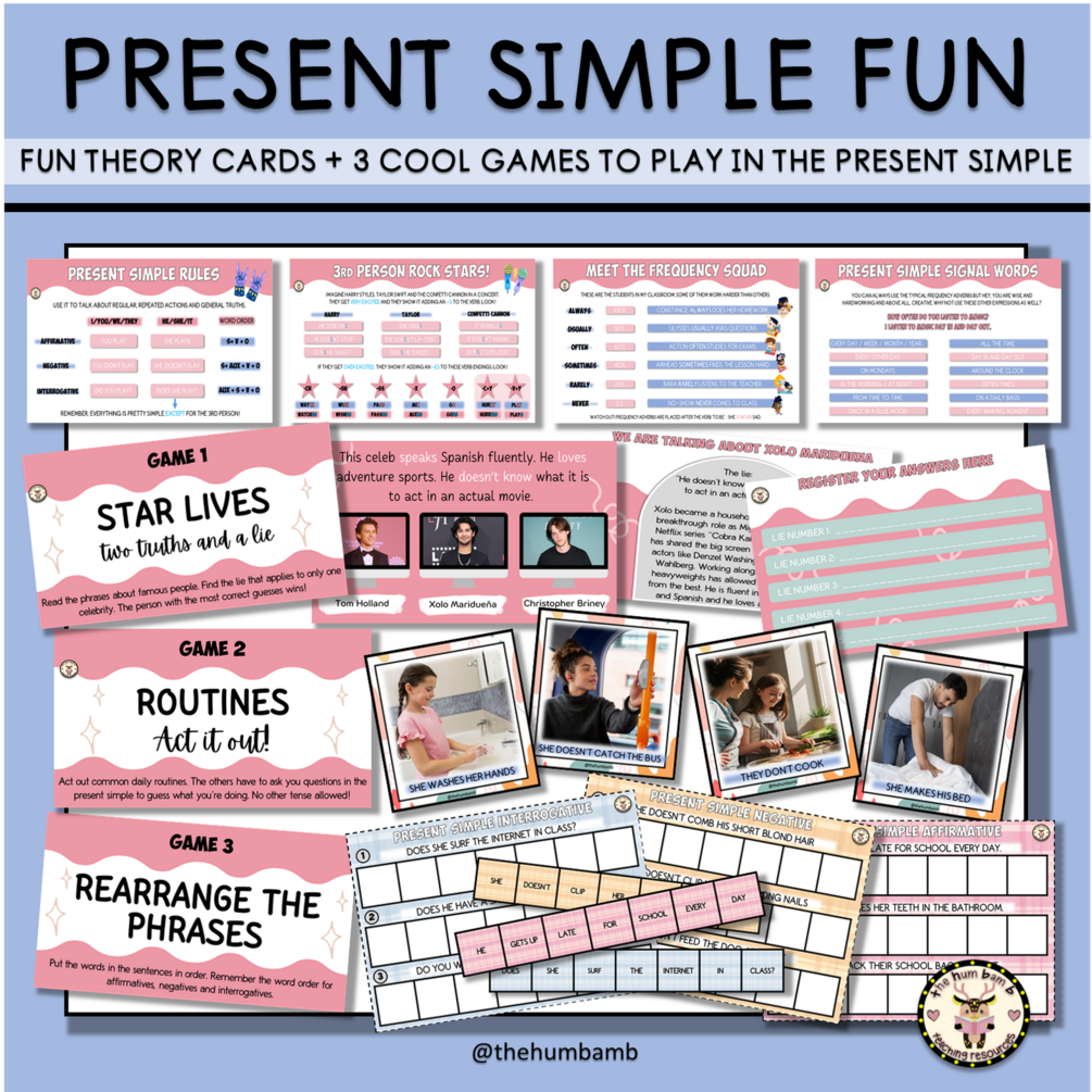 PRESENT SIMPLE GAMES BUNDLE 2 TRUTHS AND A LIE REARRANGE SENTENCE ROUTINE CHARADES